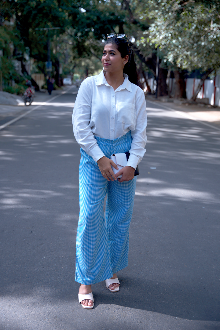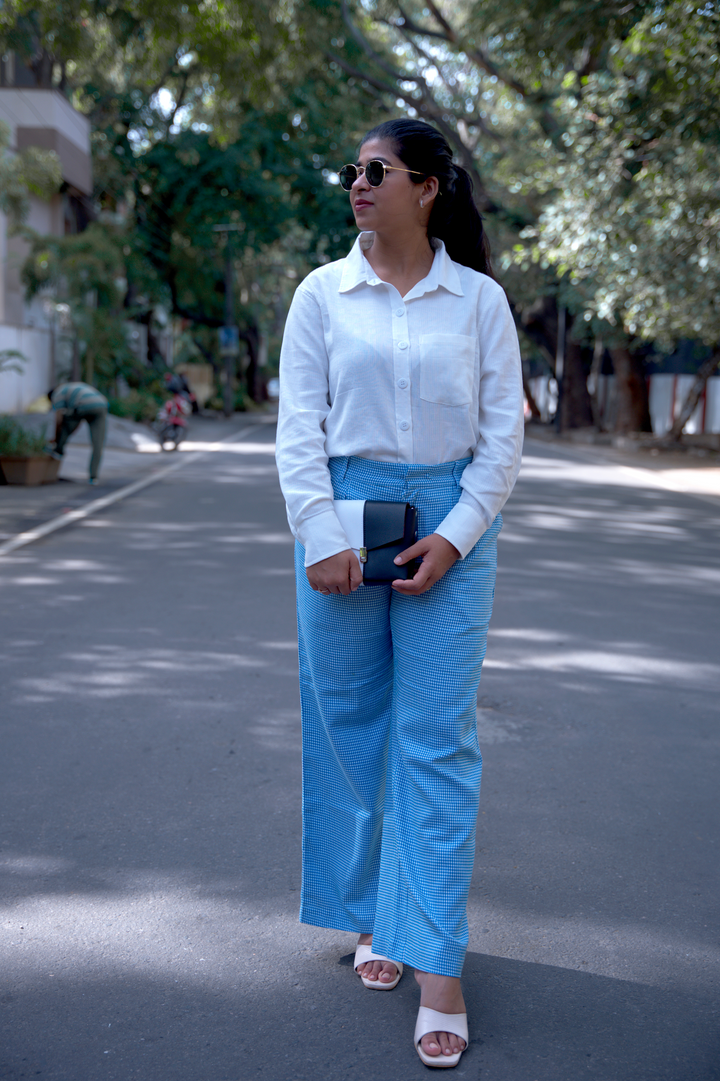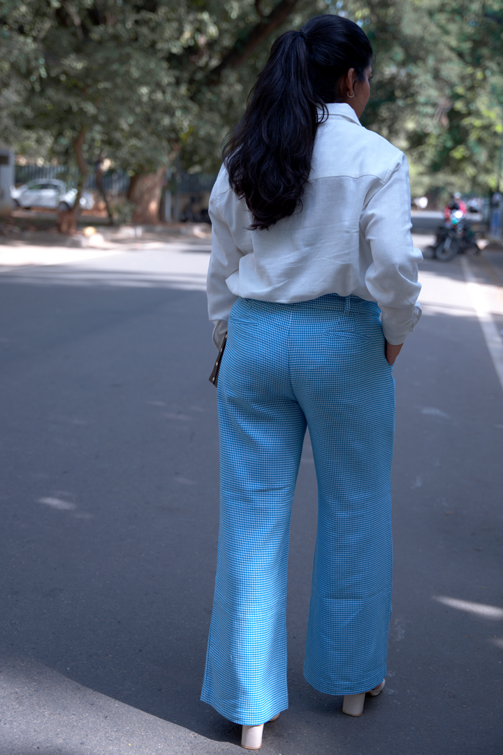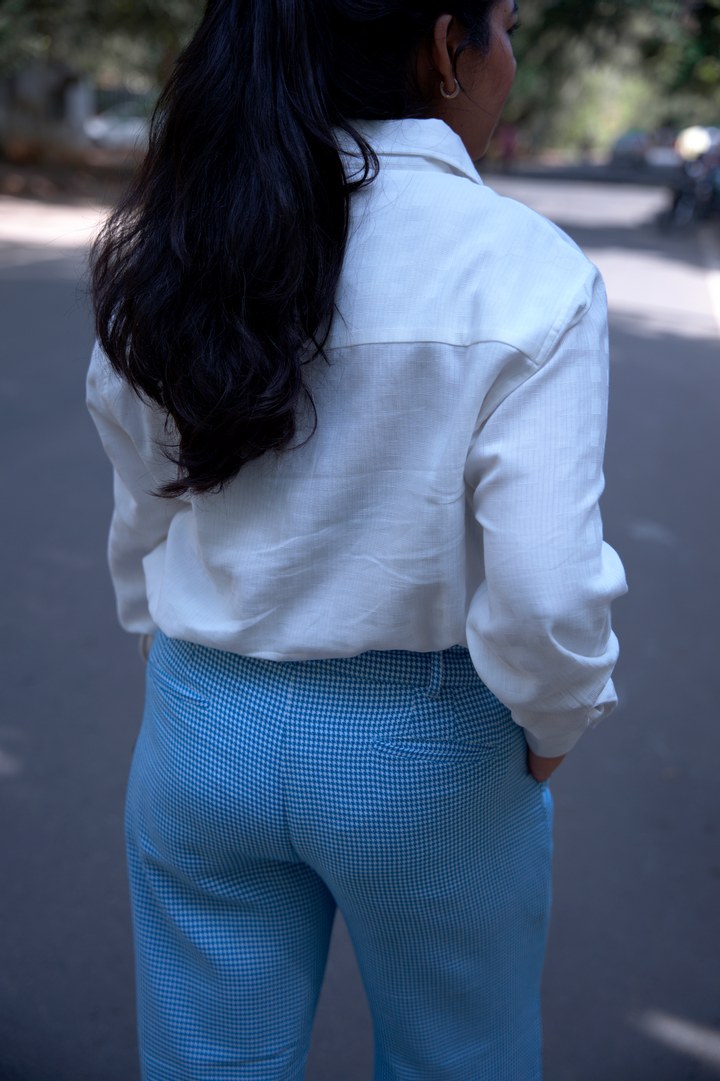 Retro-modern cobalt blue houndstooth in a poly-cotton blend, and comfort.