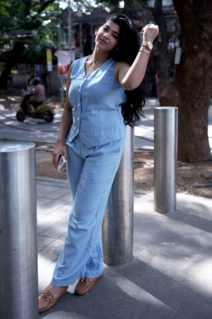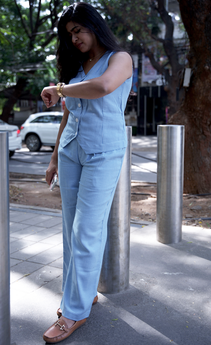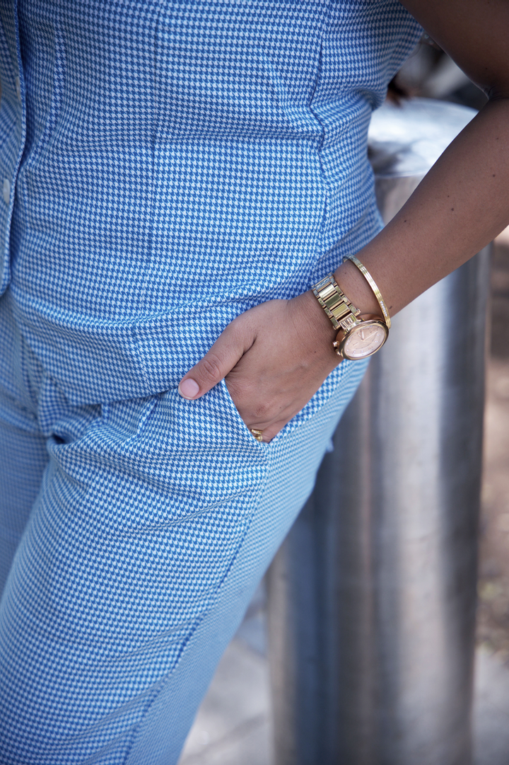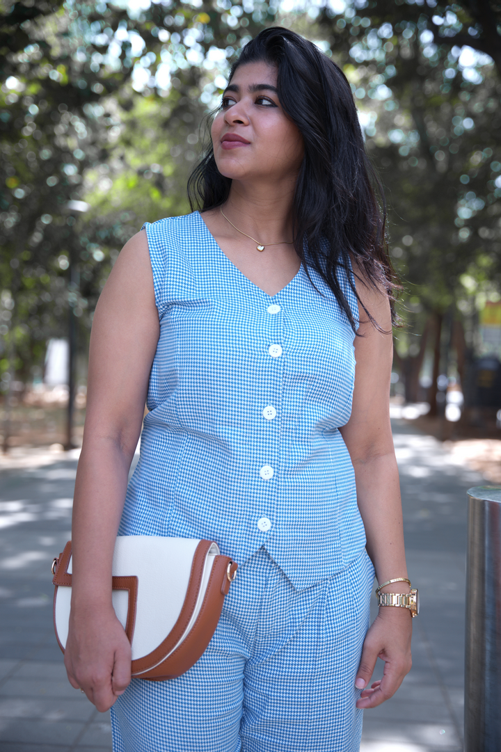 Signature co-ord of houndstooth vest and cobalt pant. All about energy, this blue-on-blue houndstooth pairing is bold, confident, and ready for anything.
