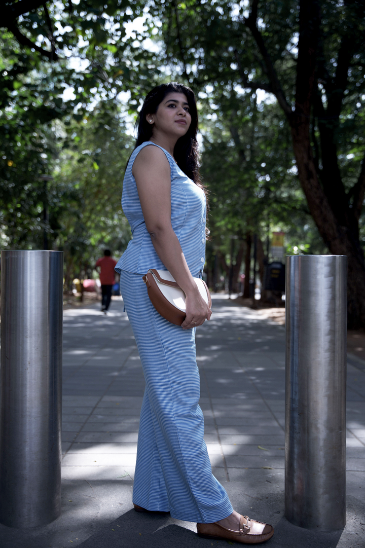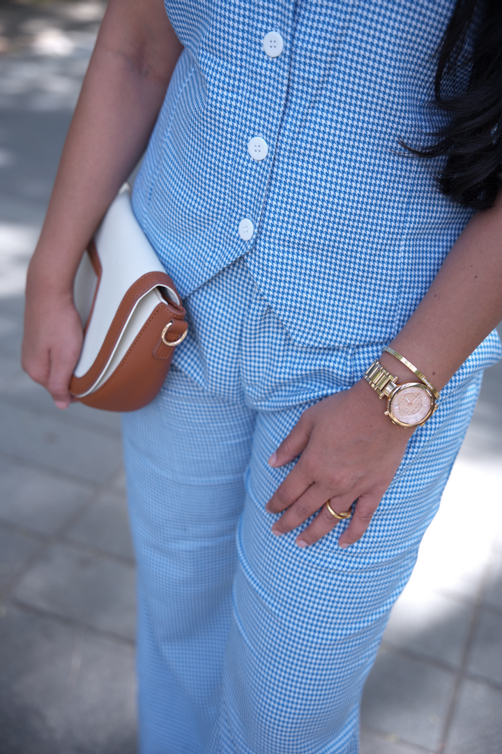 Style Tip: Keep accessories neutral and let the set do the talking.