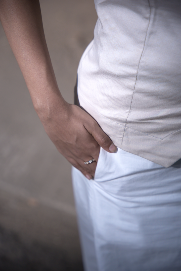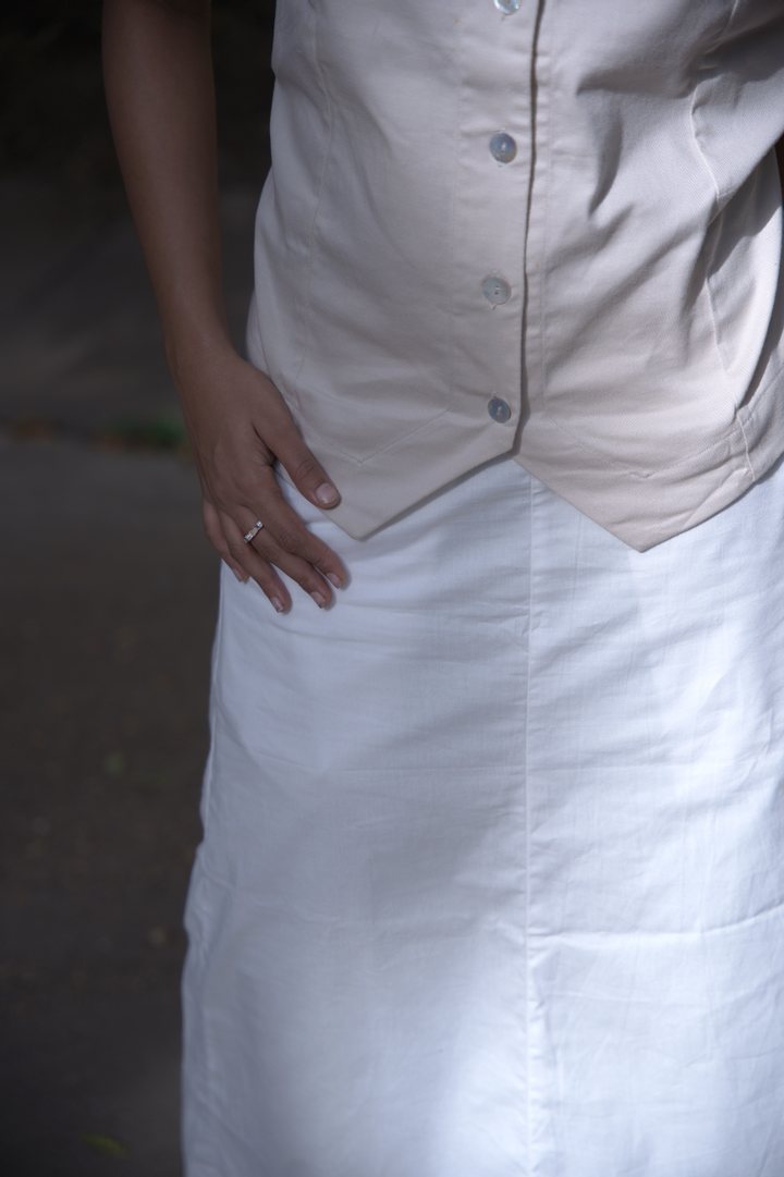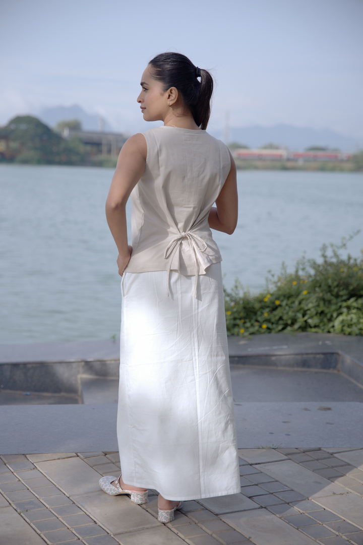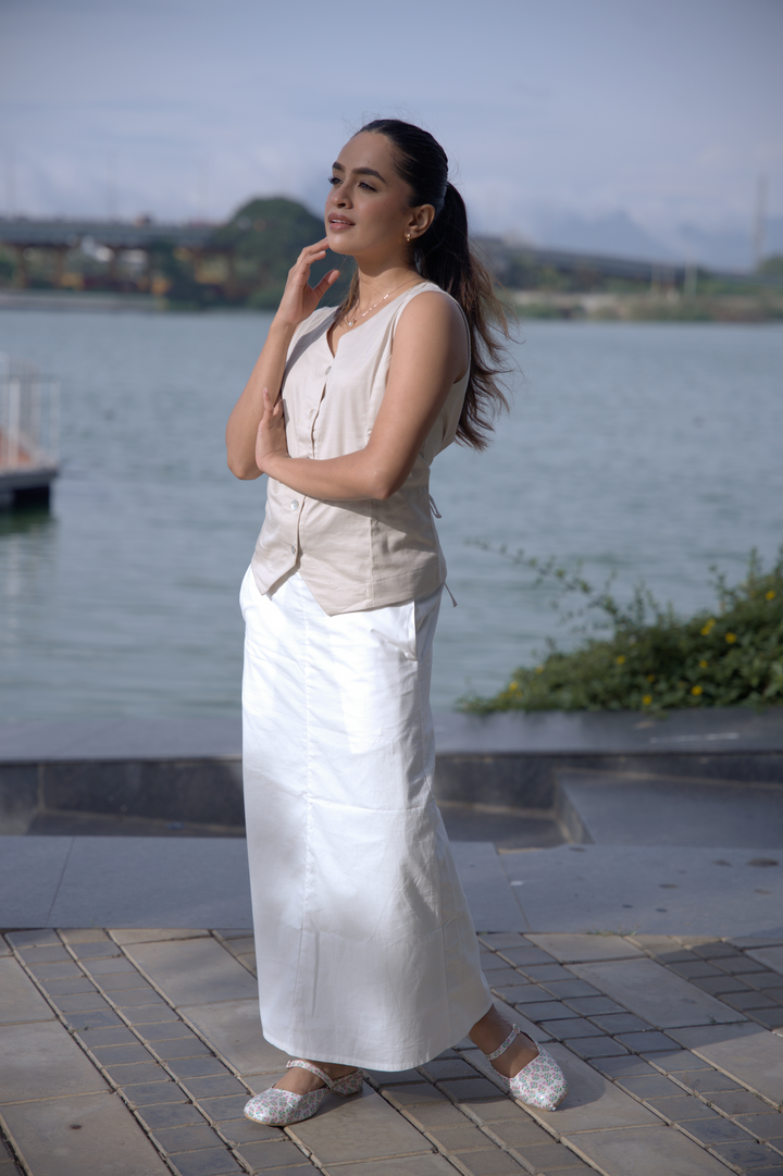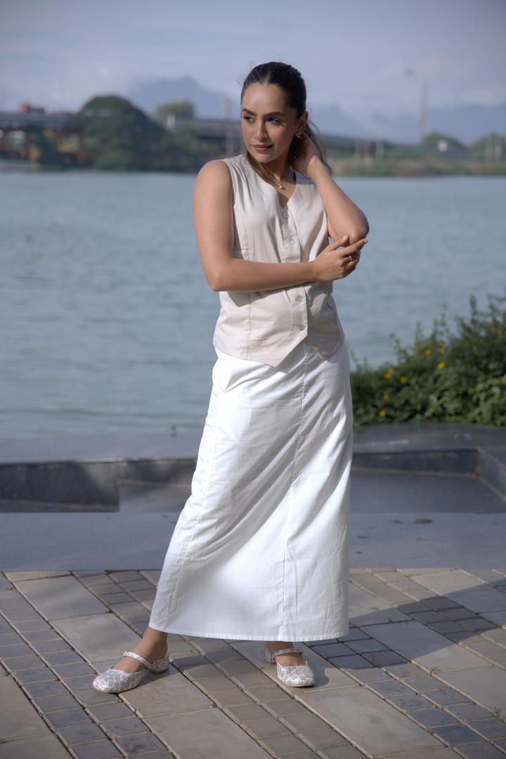 White cotton skirt with clean lines, inspired by timeless elegance. A must-have for versatile work-to-brunch outfits.