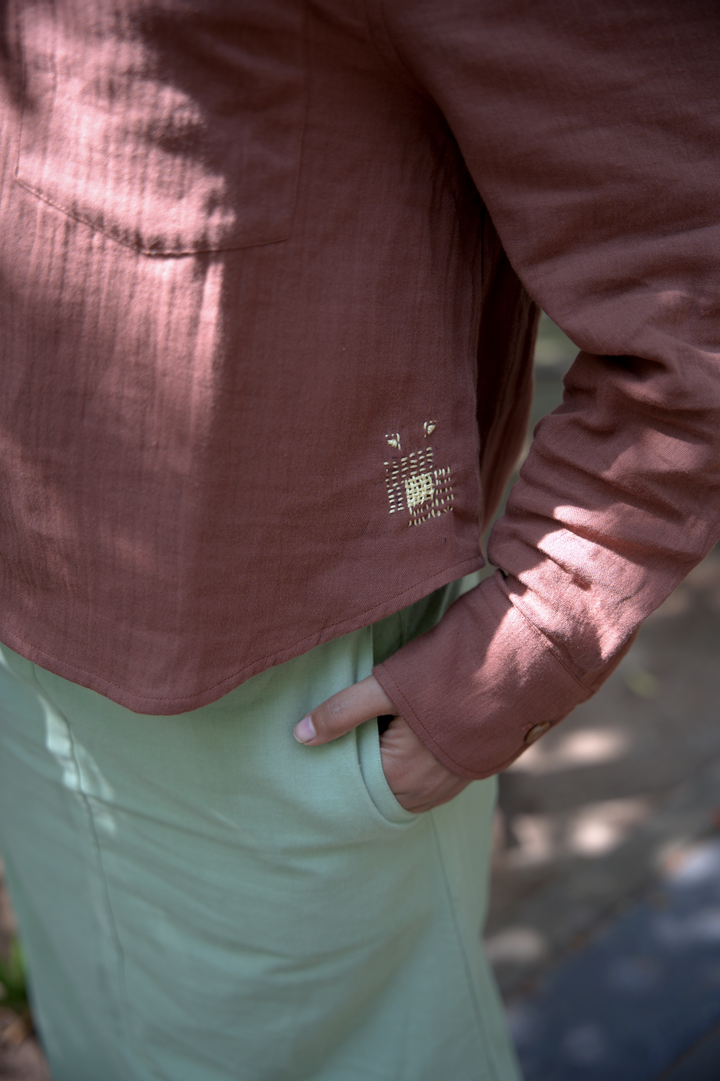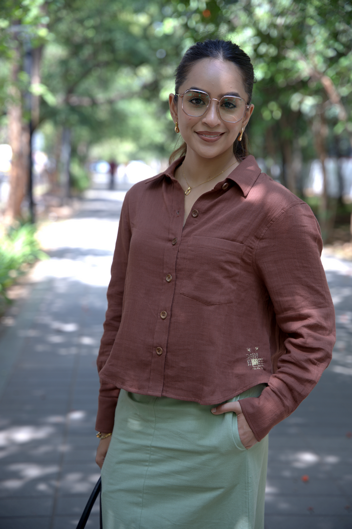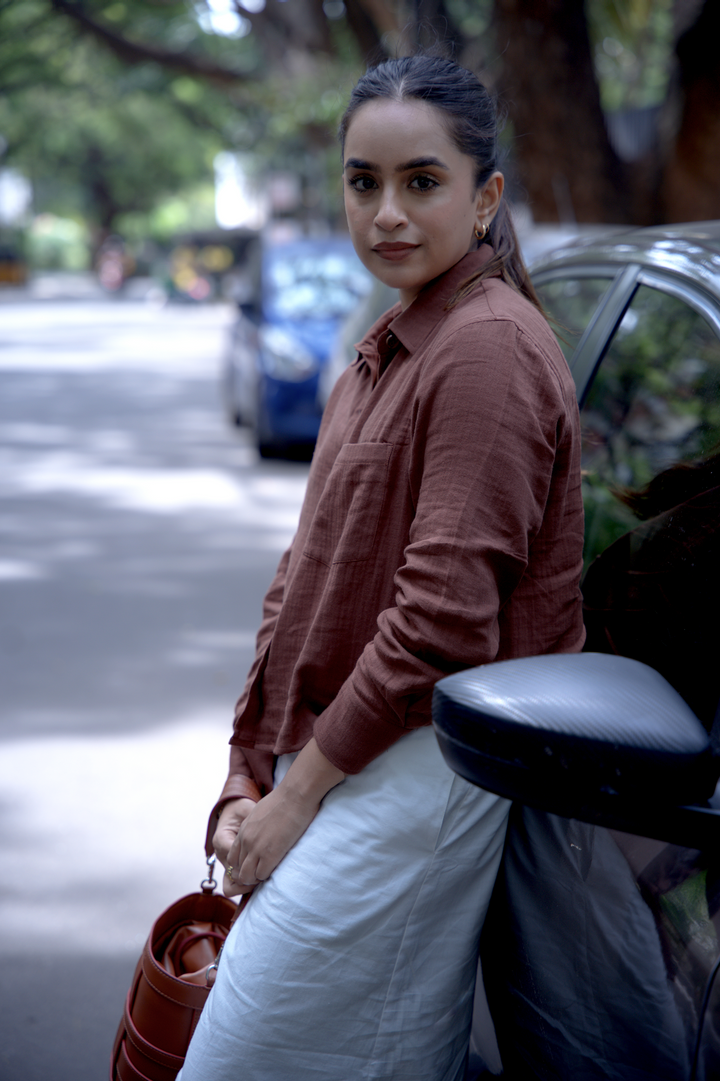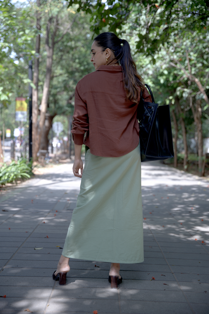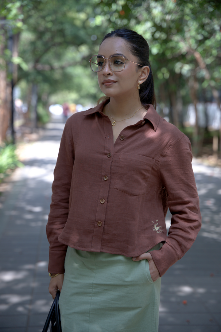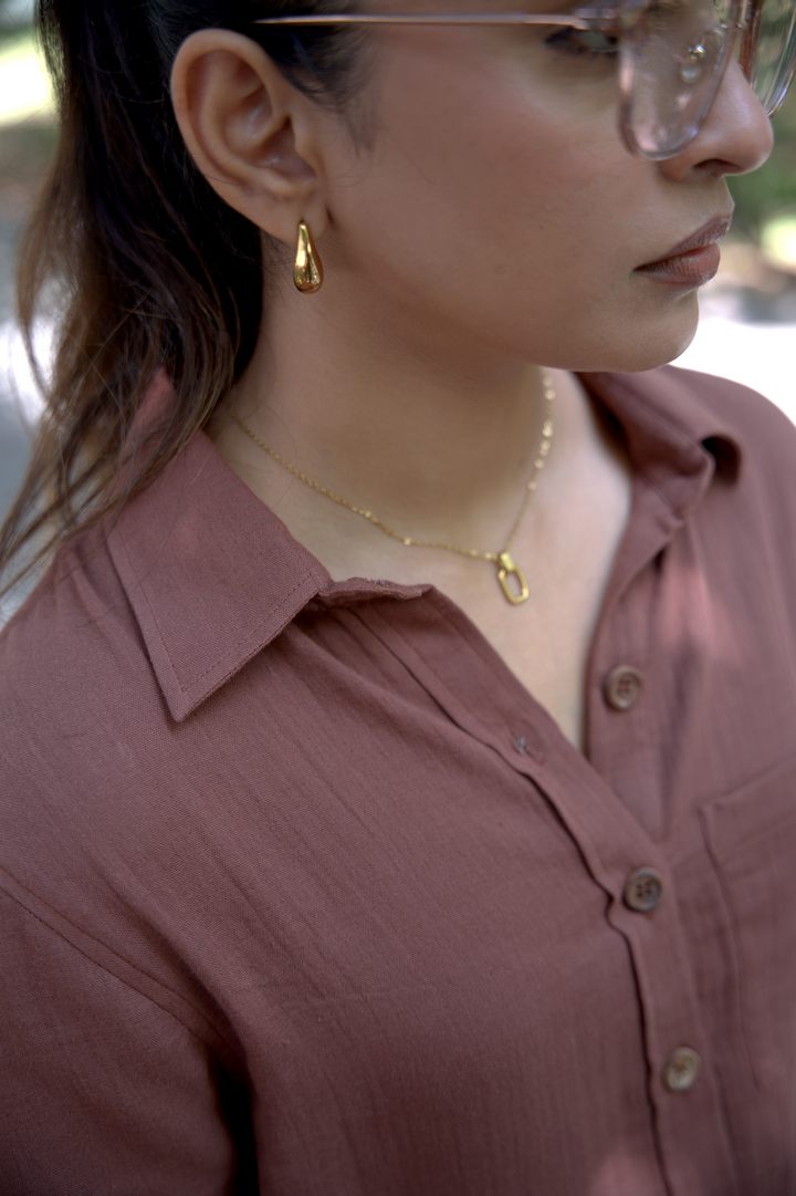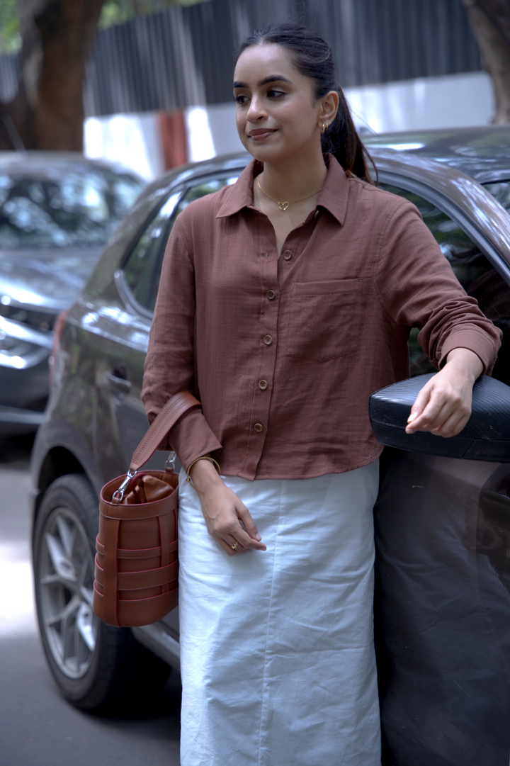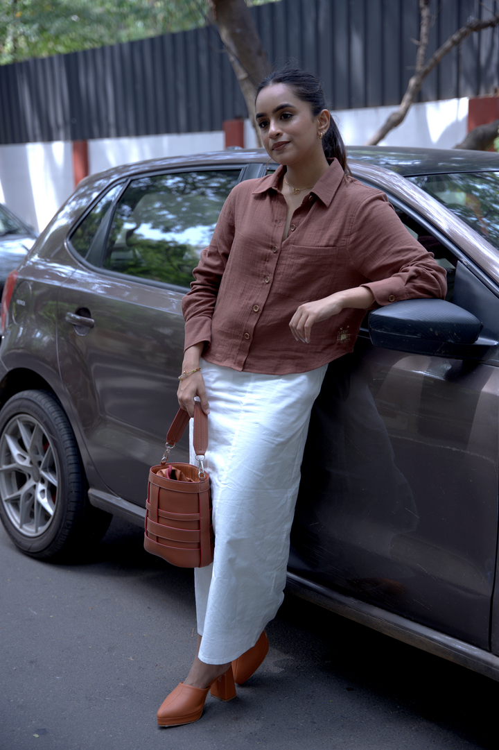 Light muslin in a rich mocha, tailored for laid-back elegance and finished with a minimal cool Mate motif.