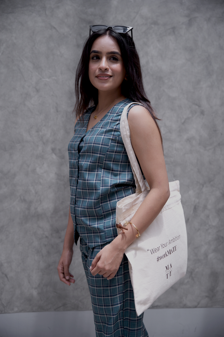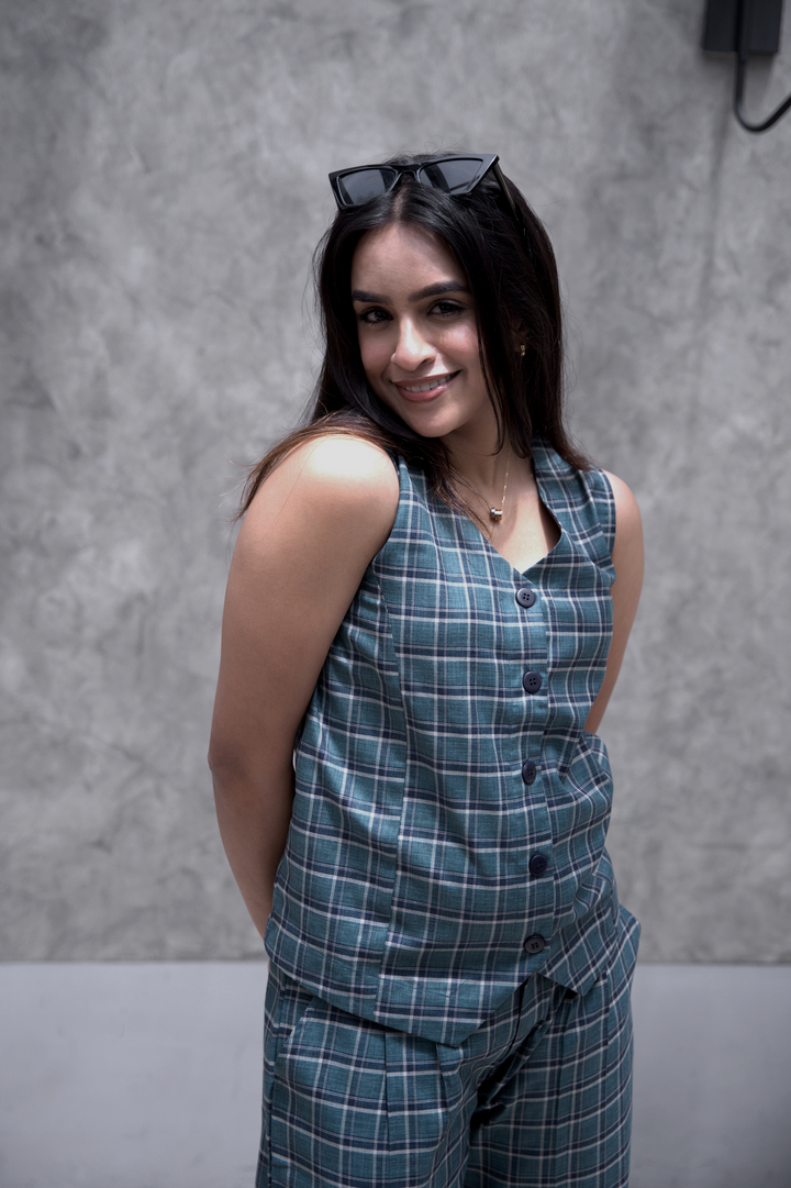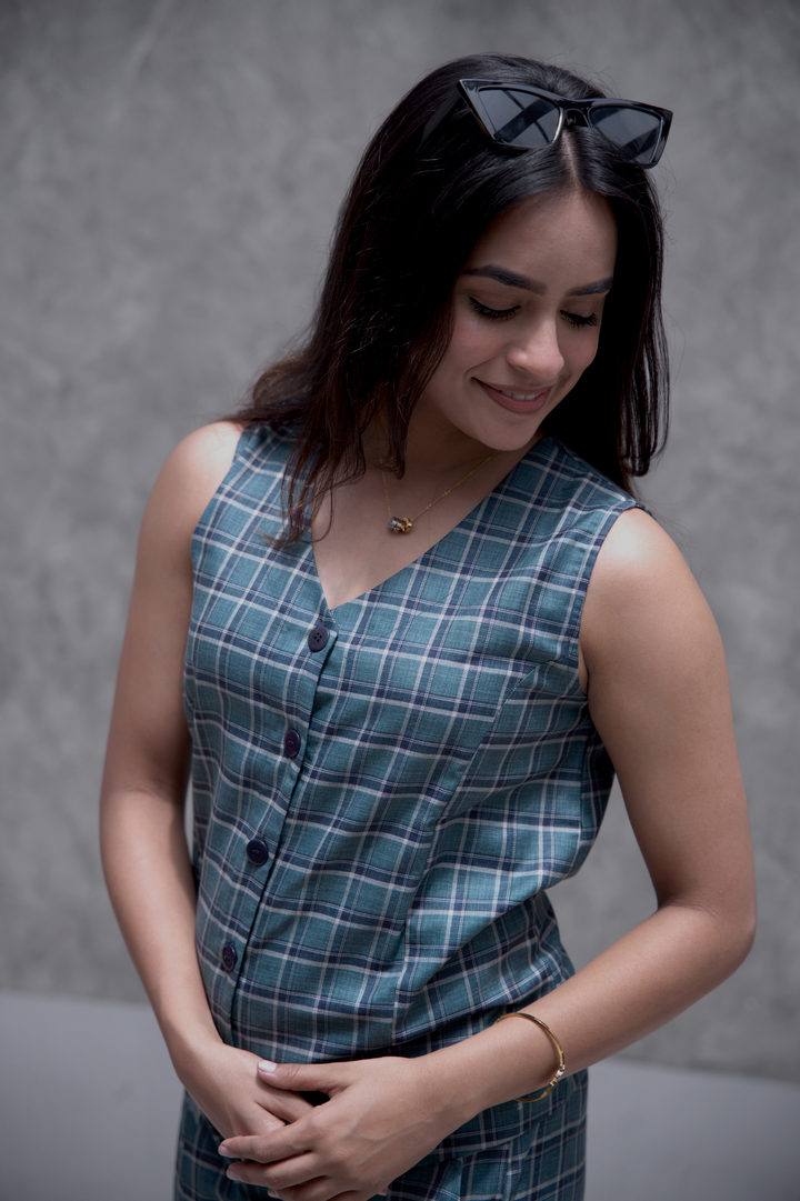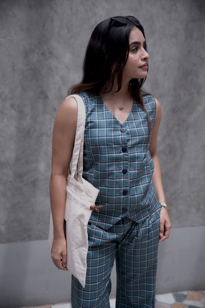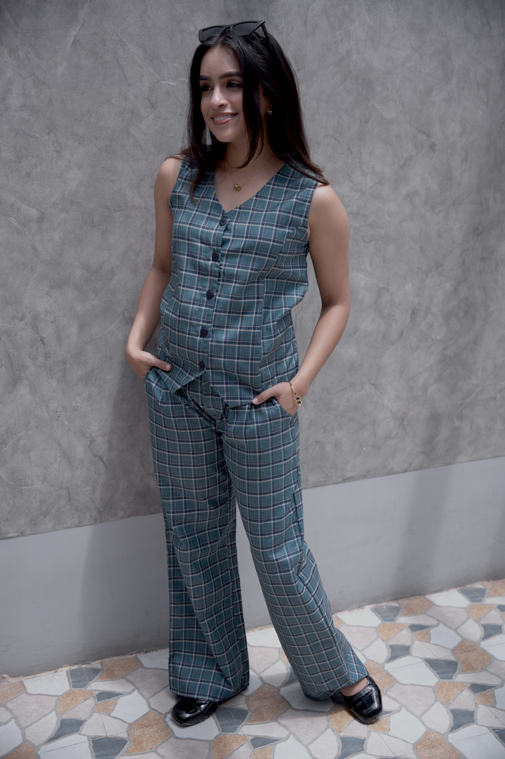 Heritage vest with green check 9 to 9 pant in poly-cotton—perfect for the modern twist on vintage-inspired co-ords.